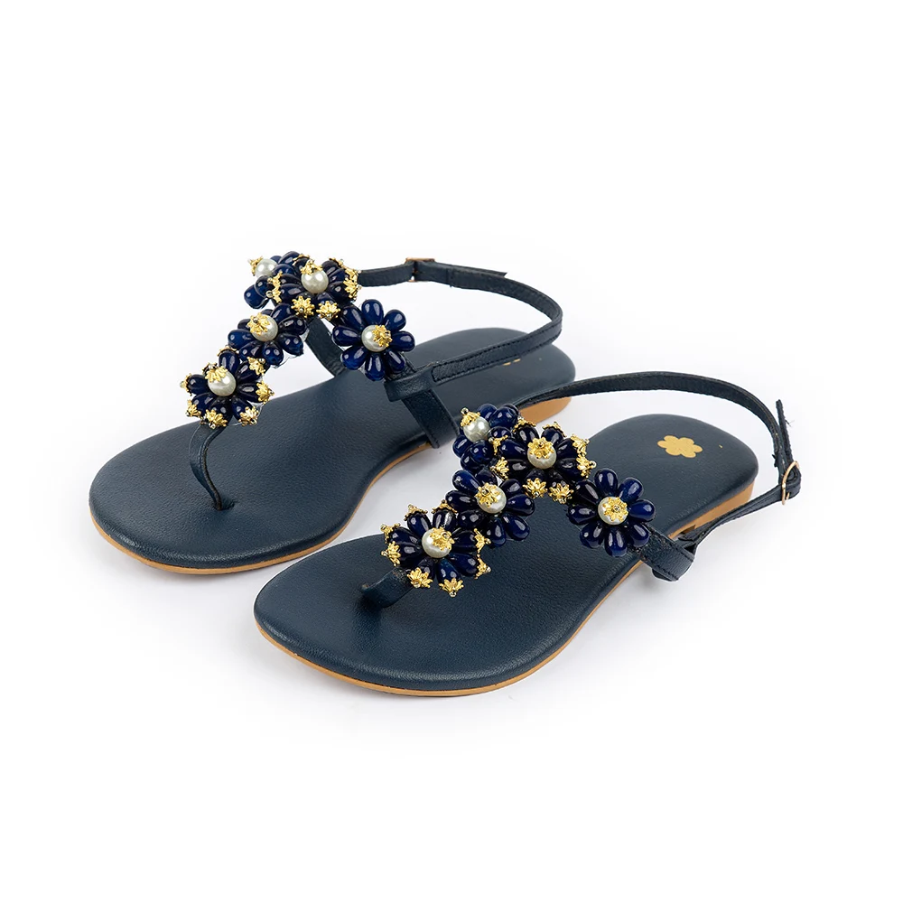 Our statement bestseller sandal, these slip ons are adorned with hand embellished floral clusters of pearls and crystals across dual straps. Each detail is carefully placed to create a three dimensional effect that feels both opulent and refined. Crafted in genuine leather with a cushioned base, they combine comfort with elegance – perfect for festive occasions or elevating everyday style.
