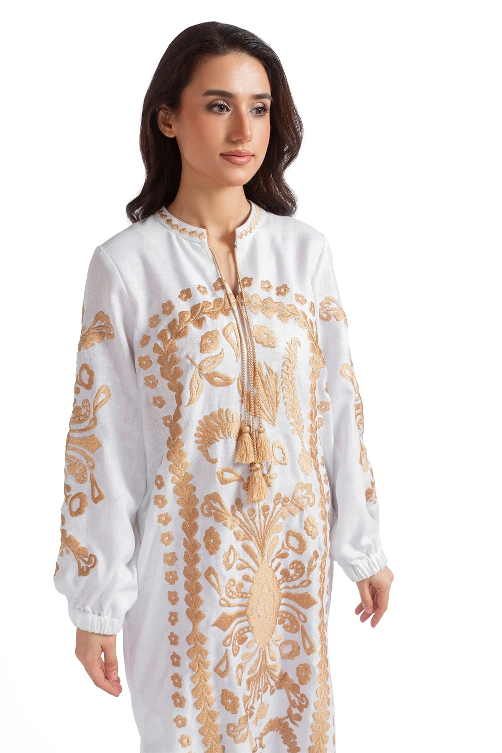 A statement tunic featuring intricate all-over embroidery inspired by traditional botanical and ornamental motifs. The bold contrast patterns frame the silhouette beautifully, while the detailed borders and sleeve designs add depth and visal interest, creating an elegant piece that blends classic craftsmanship with contemporary style.