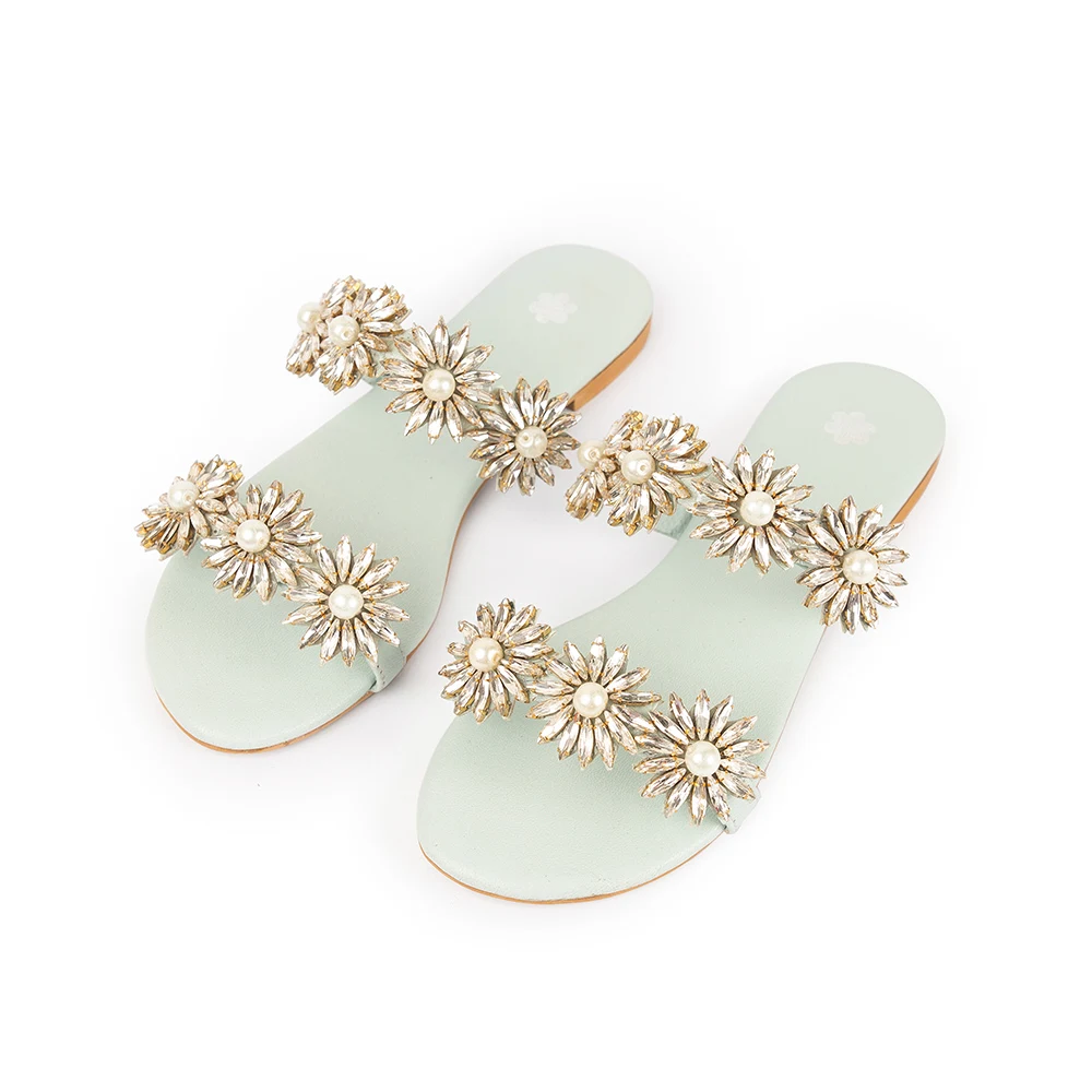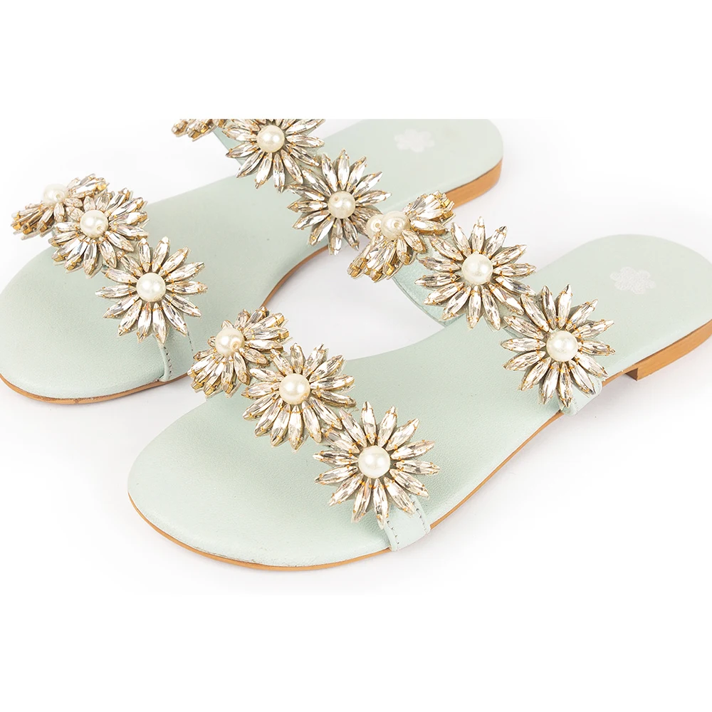 An elegant leather sandal adorned with 196 individually handcrafted crystal flower embellishments, each detailed with pearls and precision-set stones. Meticulously made with painstaking worksmanship, this design brings refined pearls and precision-set stones. Meticulously made with painstaking worksmanship, this design brings refined