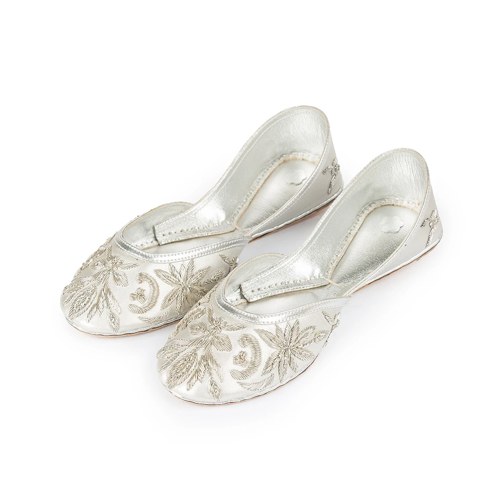 Powder blue, genuine leather sandal with crystal rows and crystal and floral detail. Elegant, comfortable and perfect for festive or everyday wear.