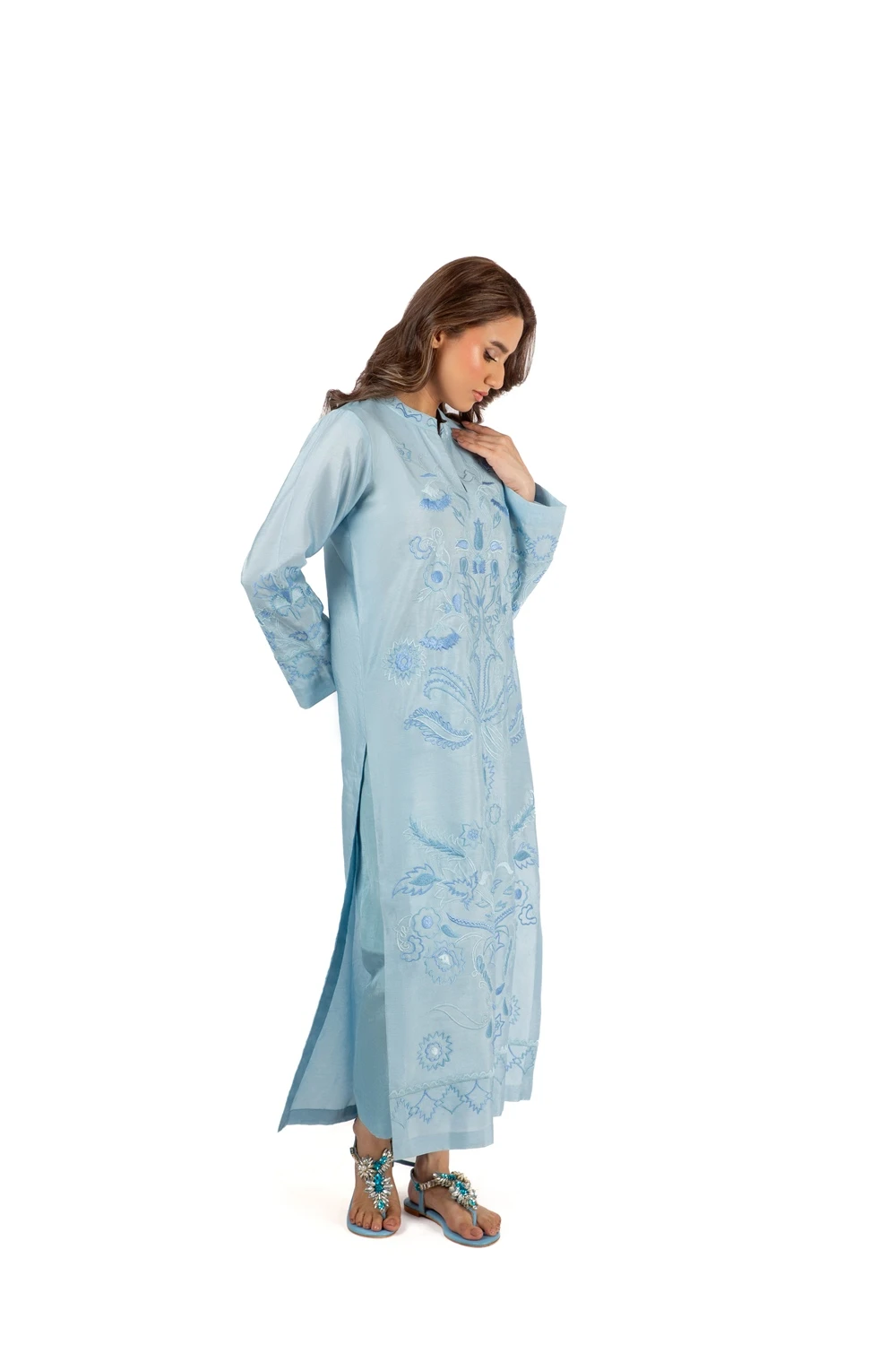Crafted in luxurious Khaadi raw silk, this elegant tunic blends timeless craftsmanship with contemporary sophistication. Intricate floral embroidery adorns the front and sleeves, creating a beautifully balanced design that feels both refined and effortless. The straight silhouette offers a relaxed yet polished fit, while the delicately detailed neckline adds a subtle modern touch.