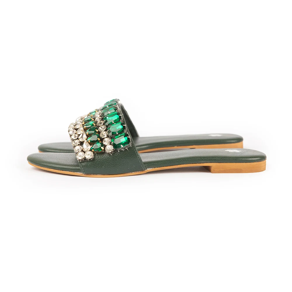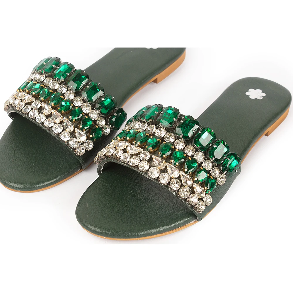 Handcrafted in soft leather, this slide sandal features multi-row crystal embellishments that create a bold, eye-catching design. Blending comfort with statement sparkle, it adds effortless glamour to both casual and festive looks