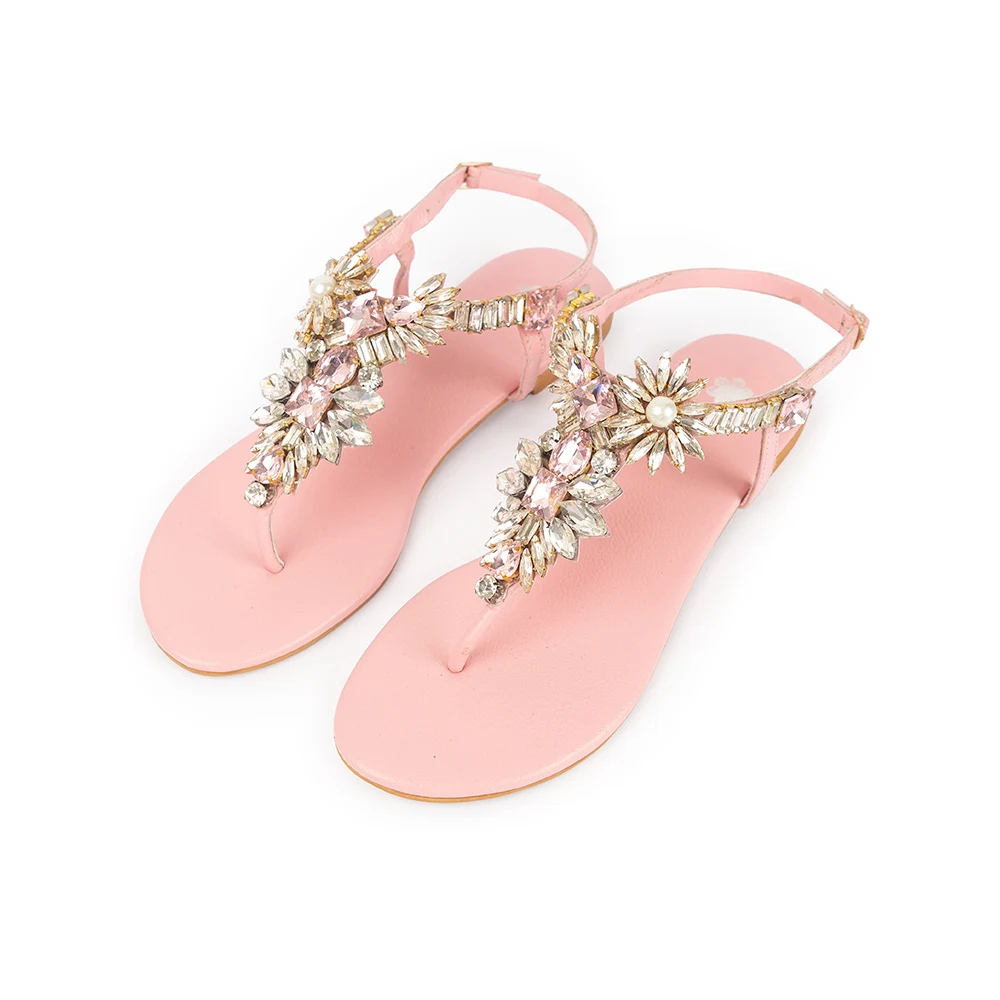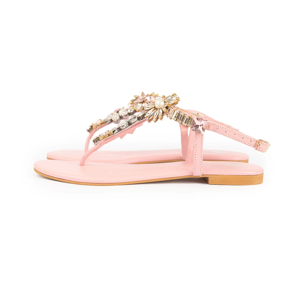 Crafted in soft leather, this elegant sandal features crystal floral embellishments with individually hand-stitched stones and pearl accents. Each pair is meticulously handmade, making every piece unique and exclusive. Perfect for occasions when you want glamour and sparkle while staying comfortably flat