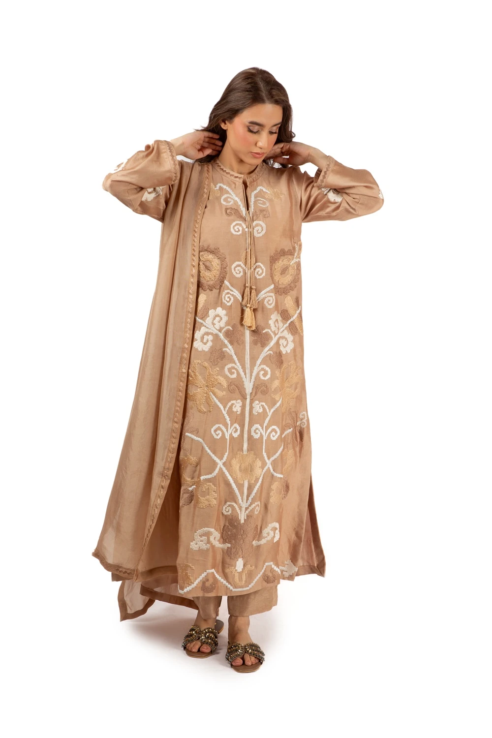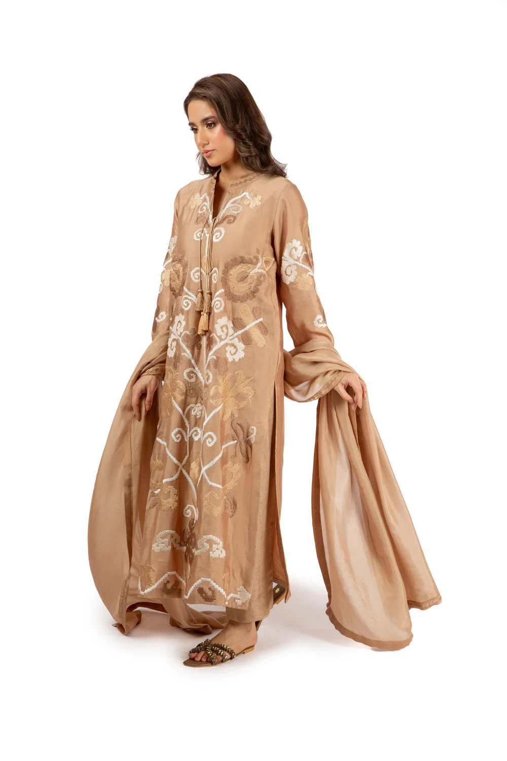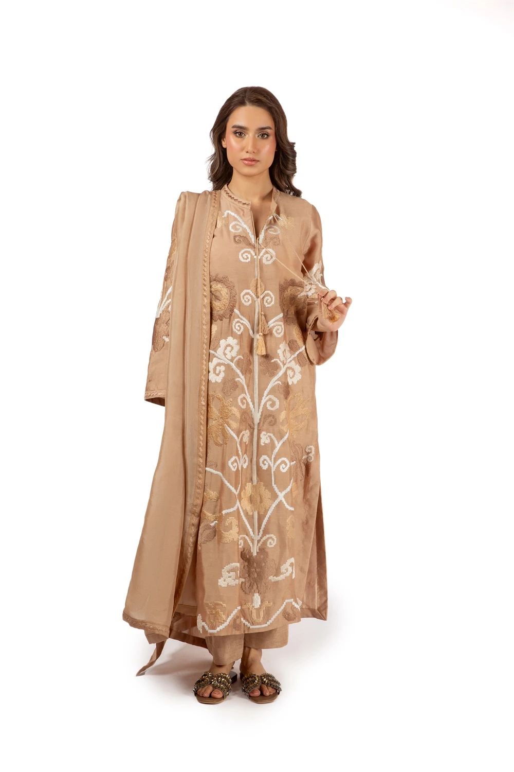 Designed to embody effortless elegance, this tunic is crafted from luxurious khaadi raw silk for a rich texture and fluid drape. Dupattaloral embroidery cascades along the front, lending depth and artisanal charm to the silhouette. The straight cut is enhanced with a delicately finished neckline adorned with tassel accents, adding a touch of movement and details. Styled with a coordinating dupatta featuring subtle embroidered borders, this ensemble is a timeless choice for festive occasions and refined day to evening wear.