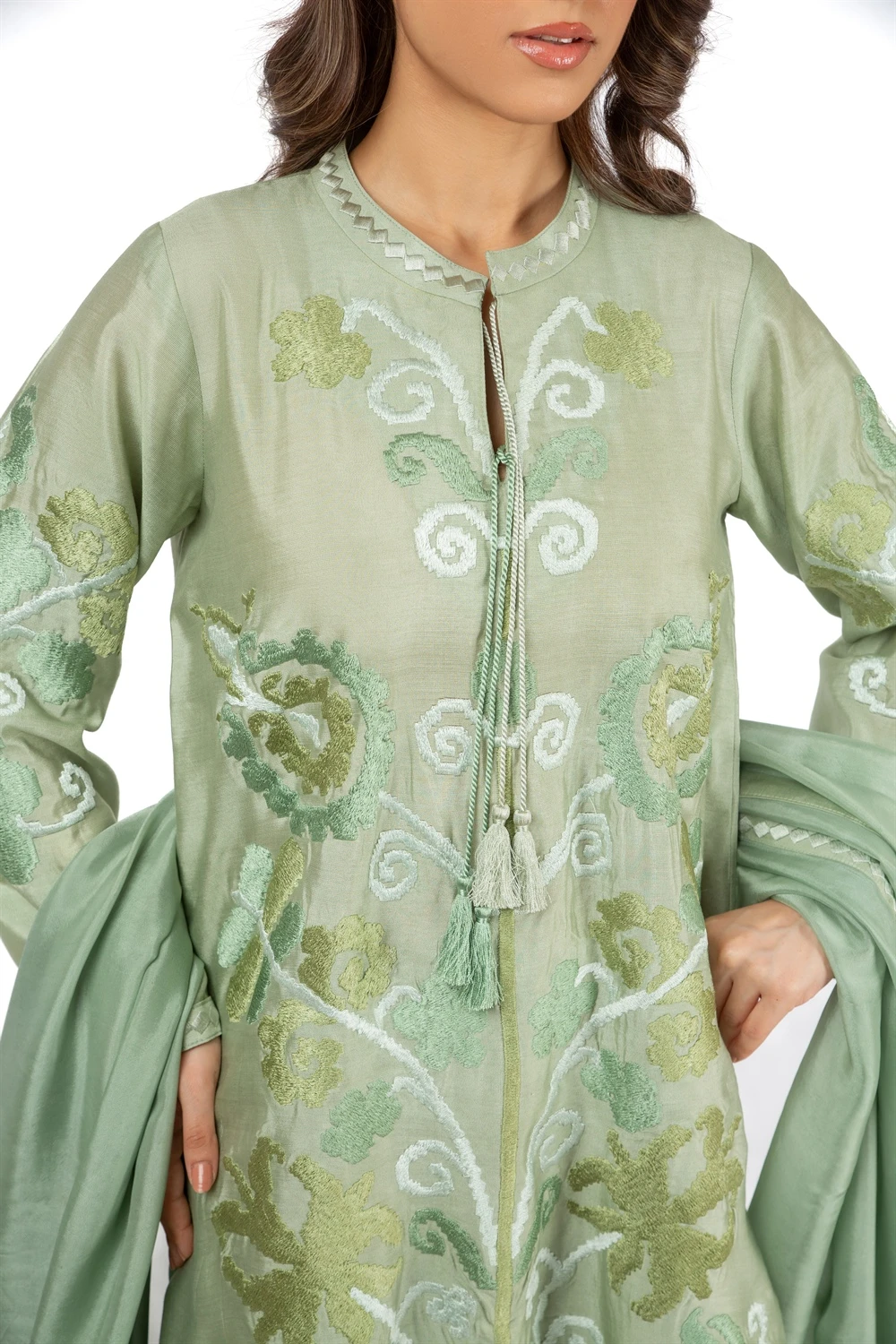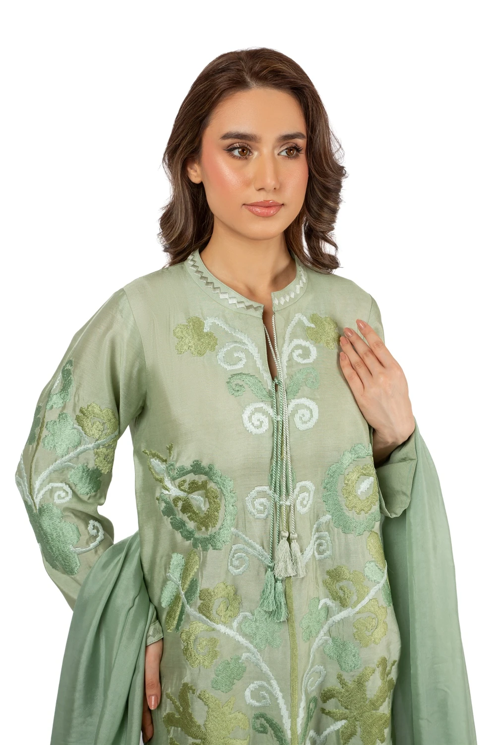 Designed to embody effortless elegance, this tunic is crafted from luxurious khaadi raw silk for a rich texture and fluid drape. Dupattaloral embroidery cascades along the front, lending depth and artisanal charm to the silhouette. The straight cut is enhanced with a delicately finished neckline adorned with tassel accents, adding a touch of movement and details. Styled with a coordinating dupatta featuring subtle embroidered borders, this ensemble is a timeless choice for festive occasions and refined day to evening wear.